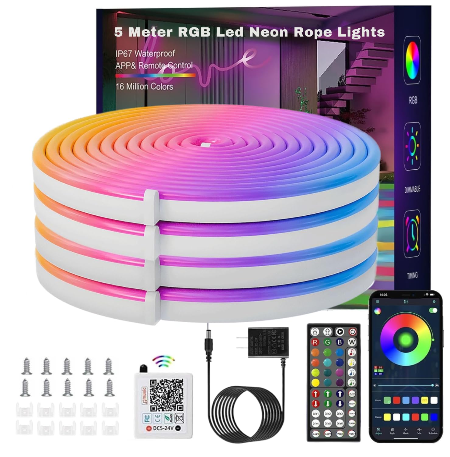 KSIPZE 5m Smart Neon LED Rope Light – RGB Music Sync, Waterproof DIY Neon Sign for Gaming & Decor