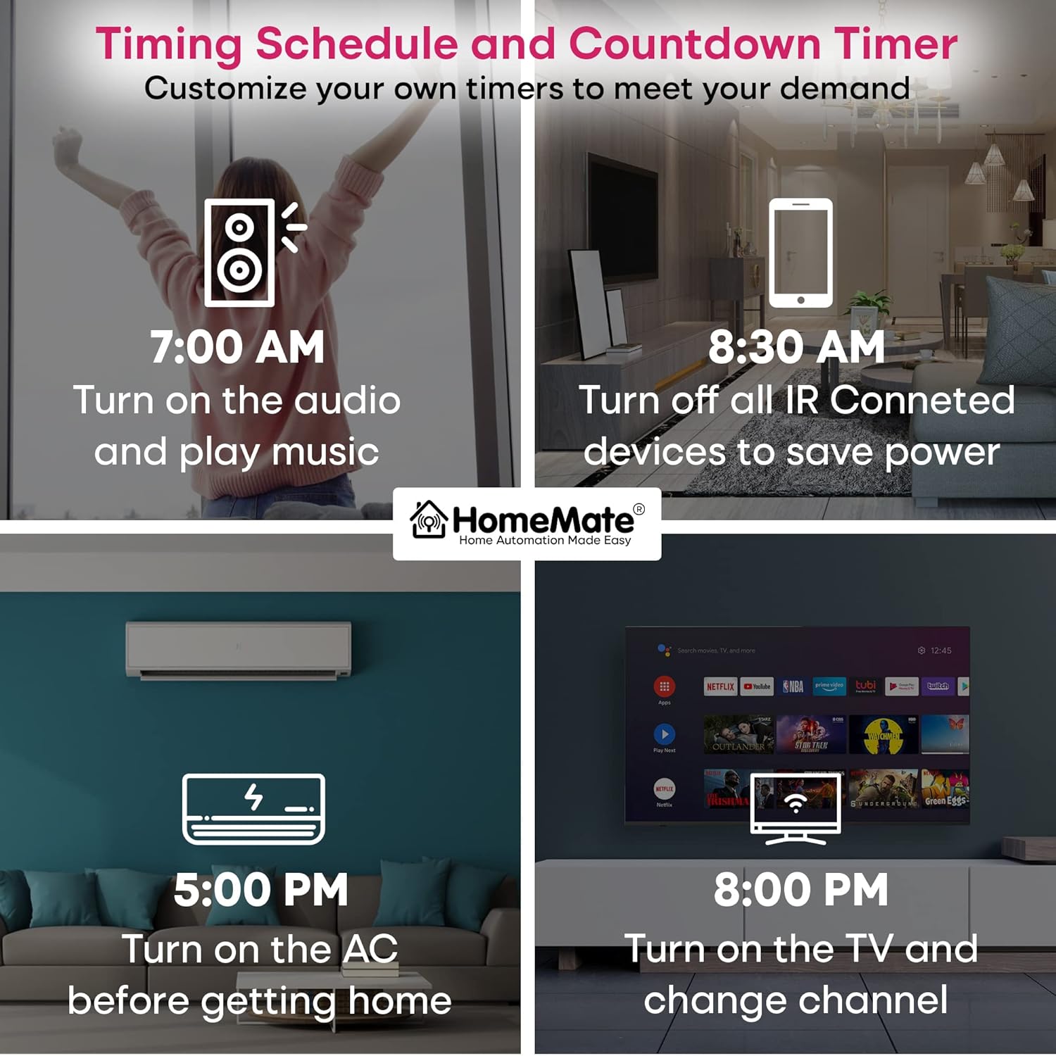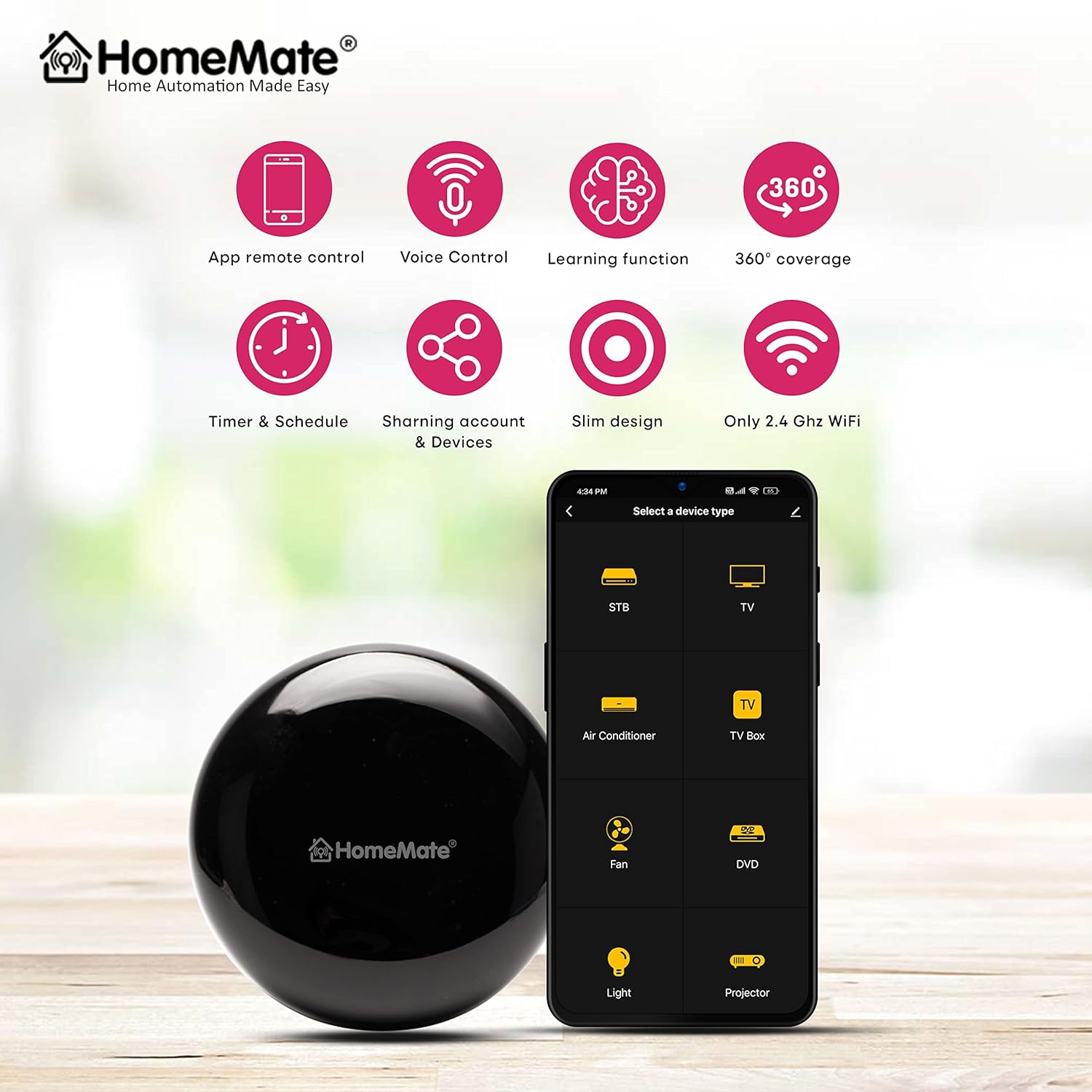 The HomeMate Smart IR Control Hub is the ultimate solution for unifying your home entertainment and climate control. This all-in-one infrared remote connects via 2.4Ghz Wi-Fi, allowing you to eliminate clutter and manage all your IR devices from a single smartphone app. It supports extensive voice commands through Amazon Alexa and Google Home, enabling automation, scheduling, and scene setting for air conditioners, televisions, and more. A simple, black retrofit device for a powerful smart home upgrade.